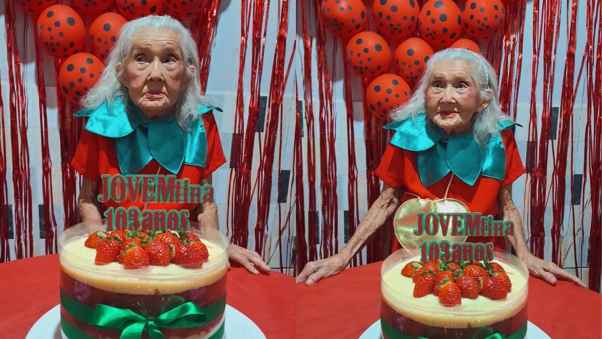 Joventina Maria da Silva Santos, conhecida como Dona Jovem, completou 103 anos em 9 de agosto e comemorou com uma festa temática inspirada no “morango do amor”, o doce que viralizou nas redes sociais.