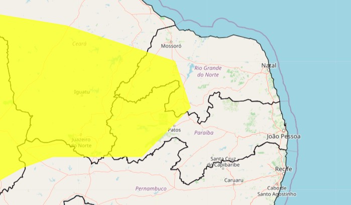 O alerta atinge diversas cidades do interior do Rio Grande do Norte, especialmente na região Oeste e Central Potiguar.