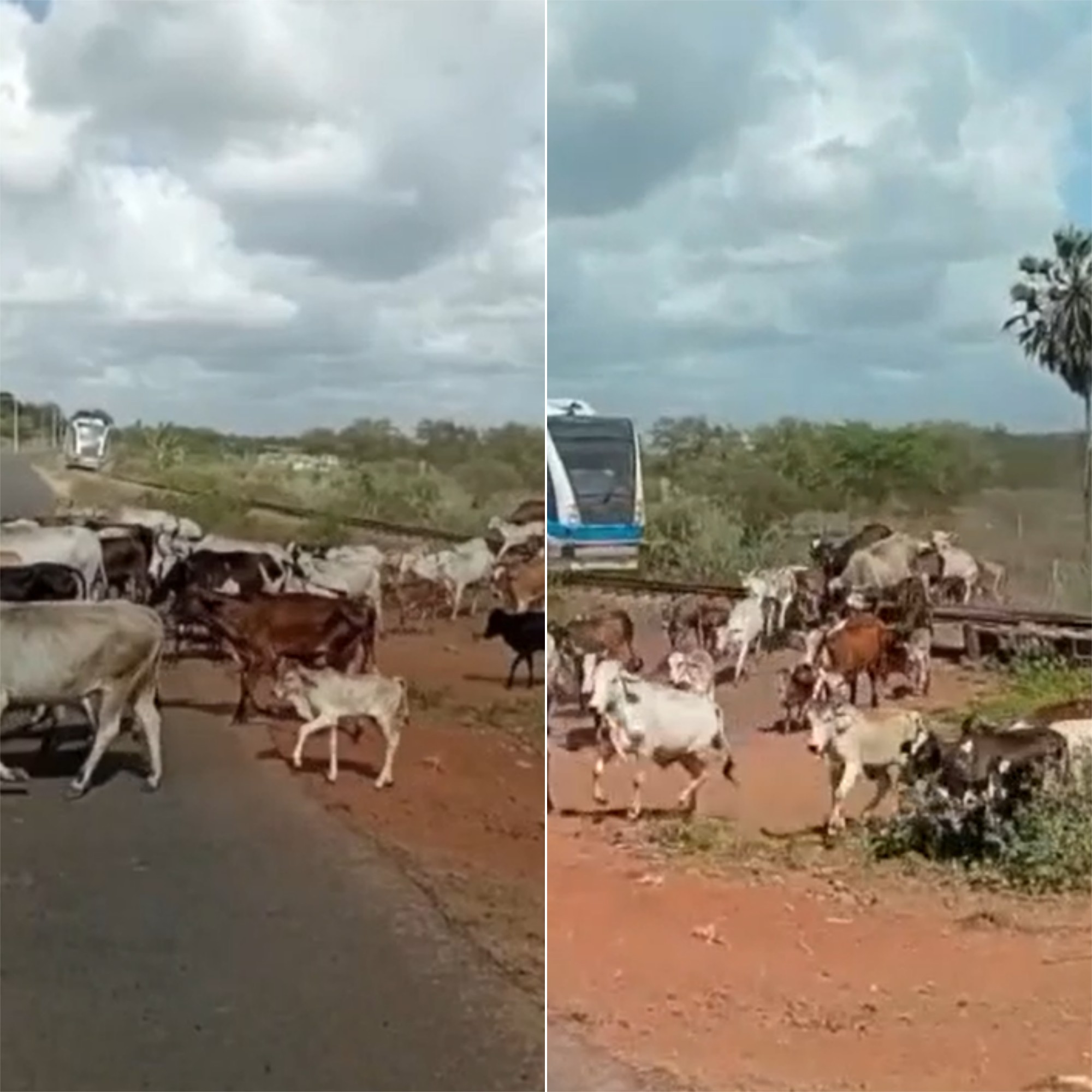 Um trem atingiu, na tarde desta quinta-feira (16), um rebanho que atravessava uma linha férrea entre as estações Ceará-mirim e Lagoa Grande, na Região Metropolitana de Natal. Vídeos de motoristas que passavam no trecho registraram o fato (veja acima).